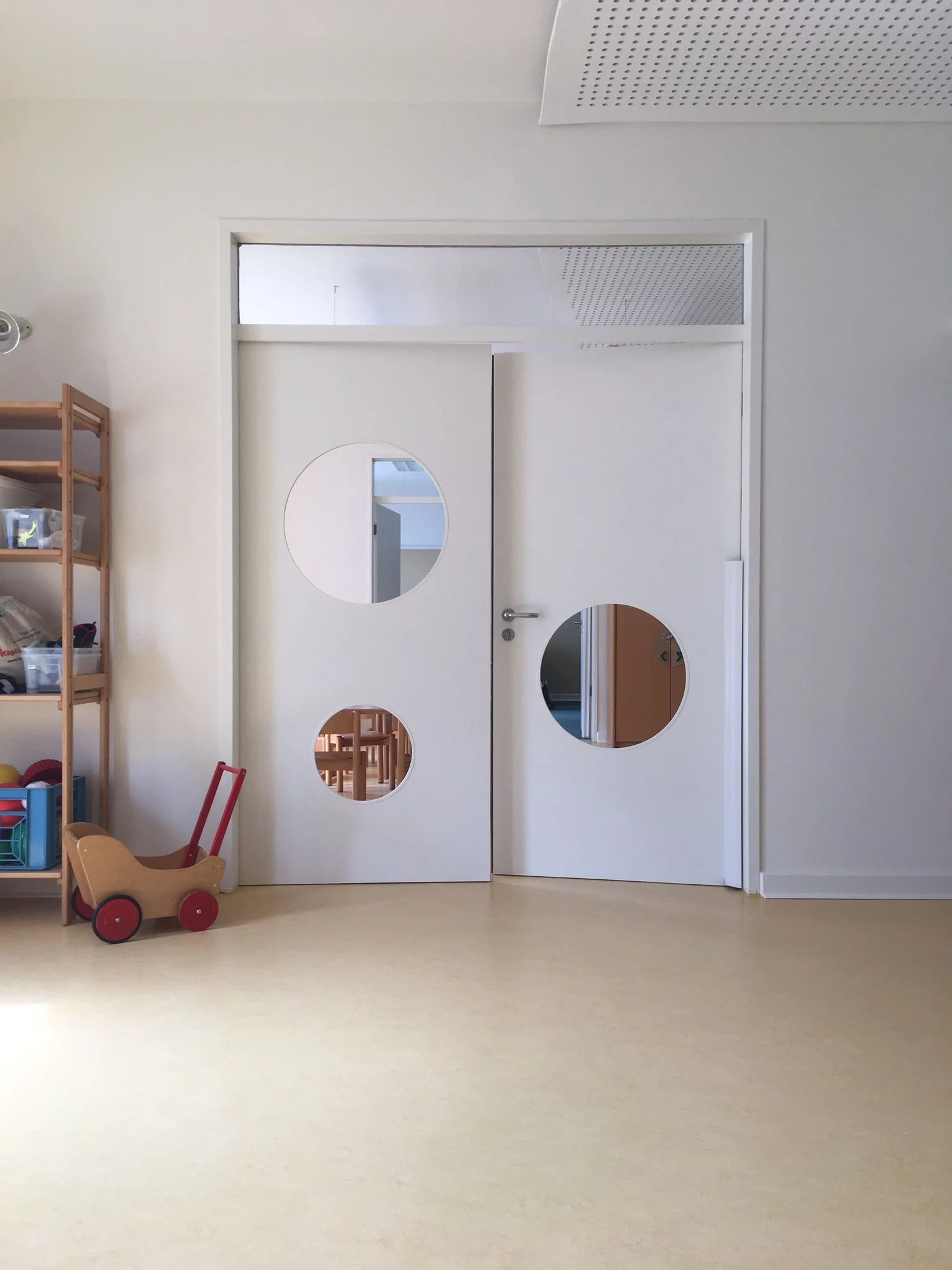 Die Farbgestaltung ist auf die Eingänge und eine Rückwand in den Gruppenräumen konzentriert. Jede Gruppe hat ihre eigene Farbe, gewählt nach dem Alter der Kinder. Größere Kinder bekamen kräftigere Farben und kleinere zarte, abgestimmt auf die Lichtverhältnisse der Flure. Die Kinder gehen durch ihr farbiges Häuschen in den Gruppenraum. So wird der Flur akzentuiert und die Identifikation für die Kinder und Erzieherinnen gestärkt. Die Zwischentüren haben wir mit Bullaugen versehen um den Kontakt zwischen den Räumen kindgerecht zu gestalten.